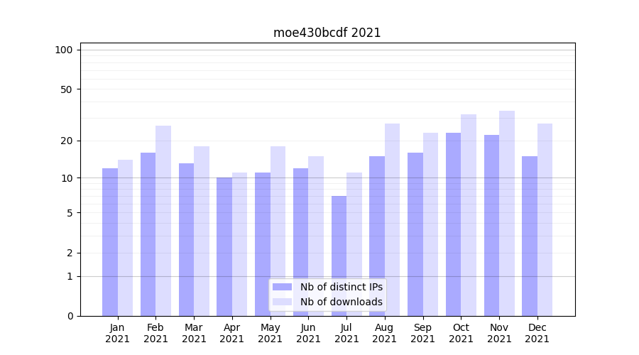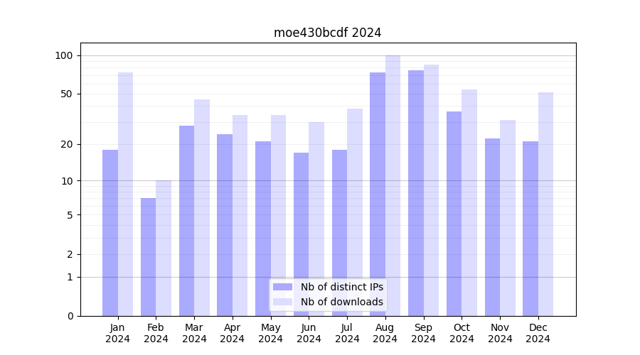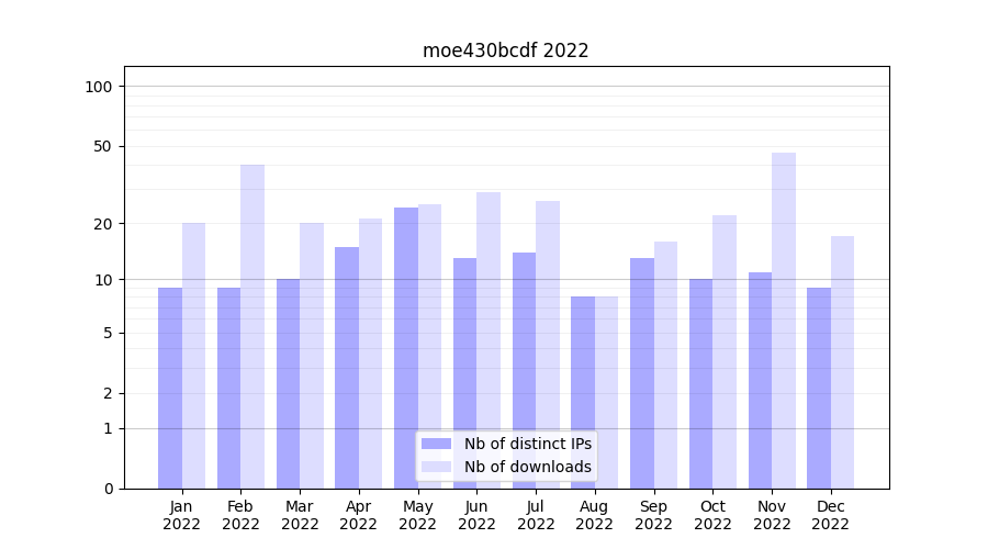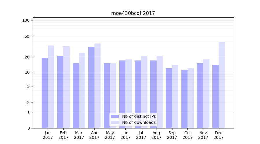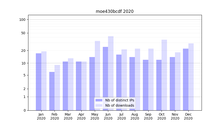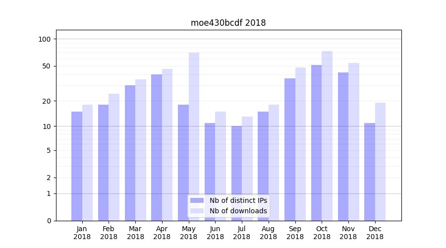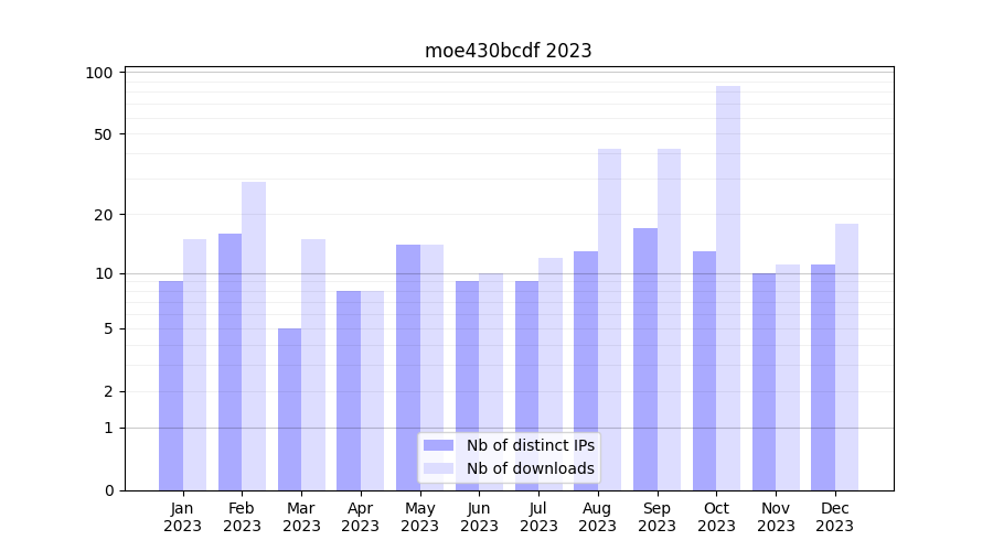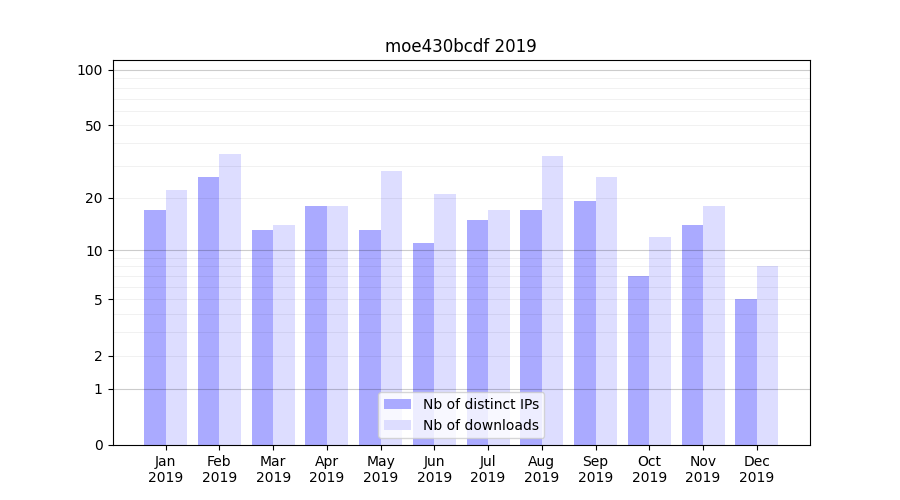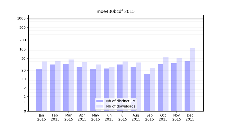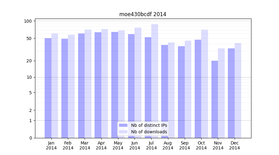 Number of downloads for annotation package moe430bcdf, year by year, from 2025 back to 2014 (years with no downloads are omitted):