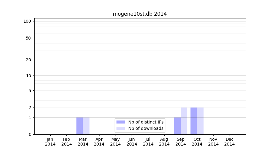 Number of downloads for annotation package mogene10st.db, year by year, from 2025 back to 2014 (years with no downloads are omitted):
