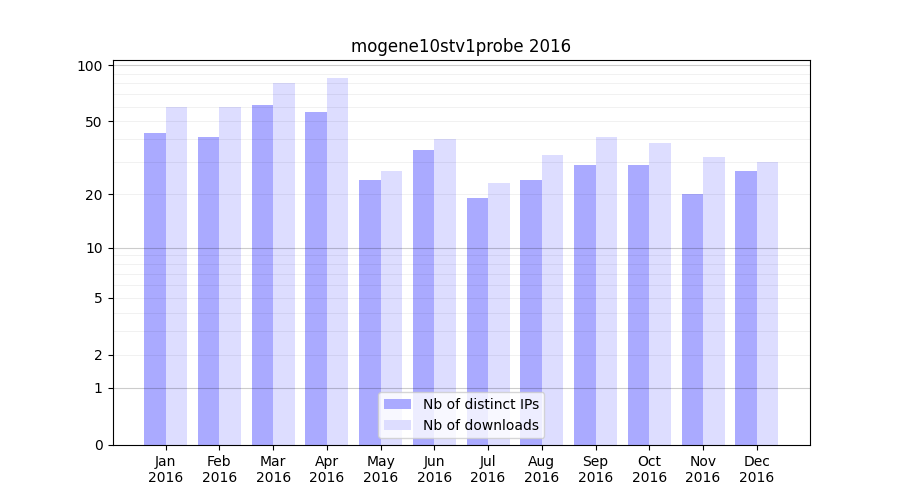 Number of downloads for annotation package mogene10stv1probe, year by year, from 2025 back to 2014 (years with no downloads are omitted):