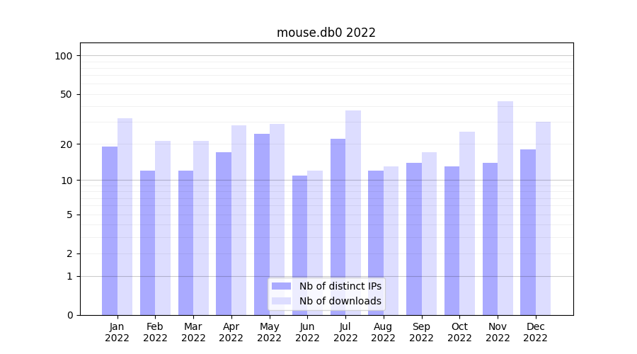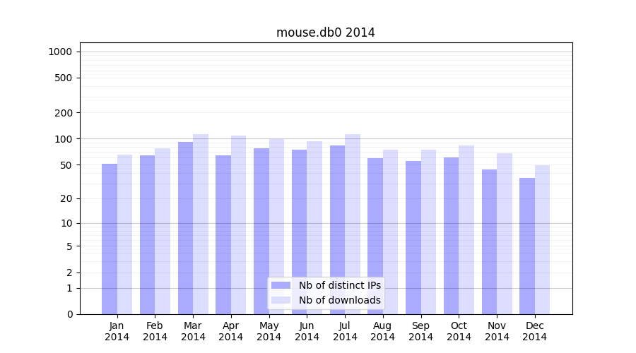 Number of downloads for annotation package mouse.db0, year by year, from 2025 back to 2014 (years with no downloads are omitted):