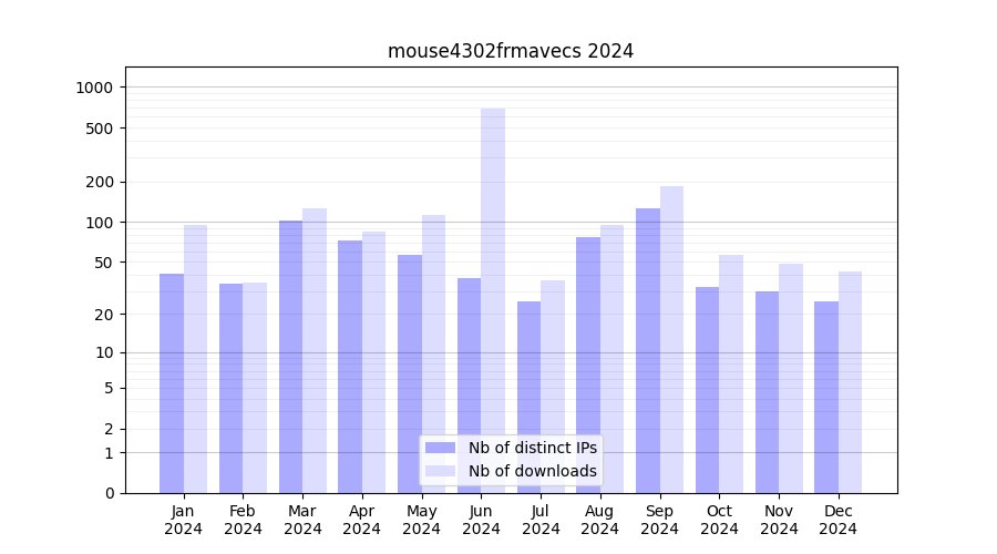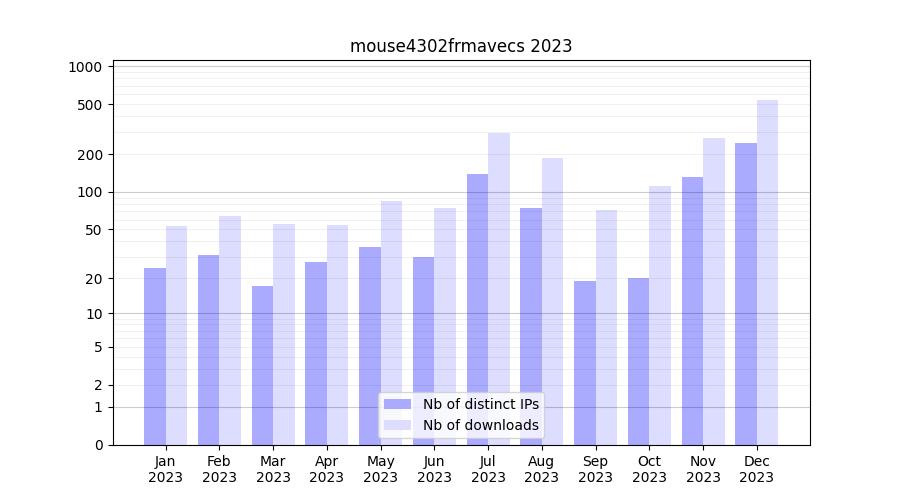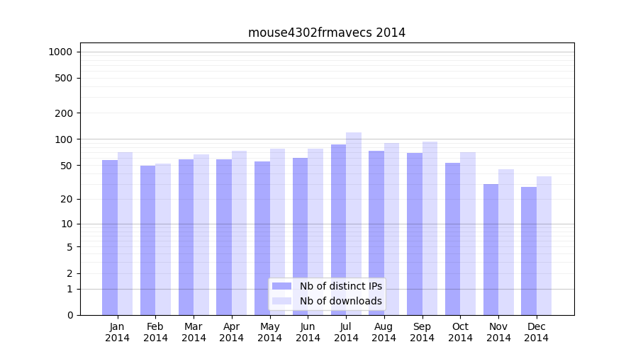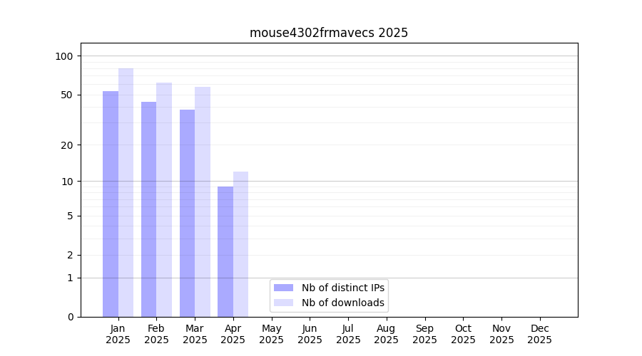 Number of downloads for annotation package mouse4302frmavecs, year by year, from 2025 back to 2014 (years with no downloads are omitted):