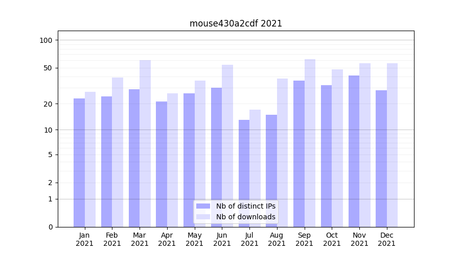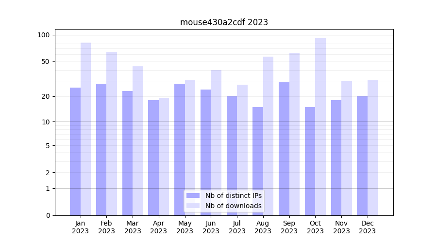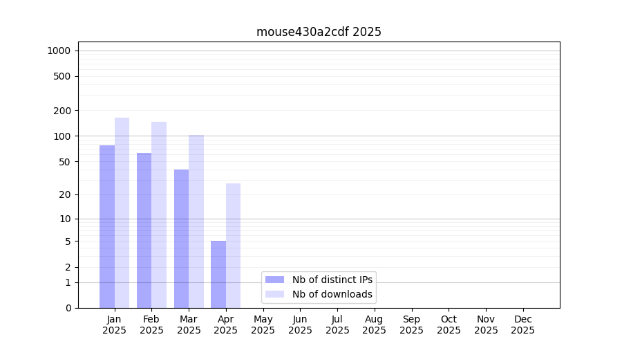 Number of downloads for annotation package mouse430a2cdf, year by year, from 2025 back to 2014 (years with no downloads are omitted):