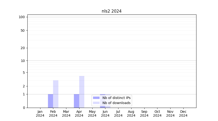Number of downloads for annotation package nls2, year by year, from 2025 back to 2014 (years with no downloads are omitted):