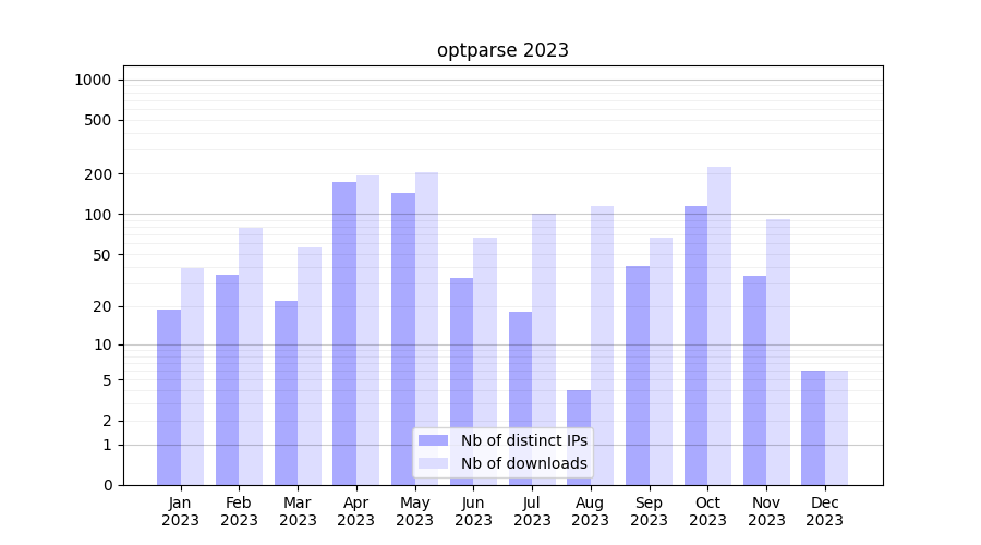 Number of downloads for annotation package optparse, year by year, from 2025 back to 2014 (years with no downloads are omitted):