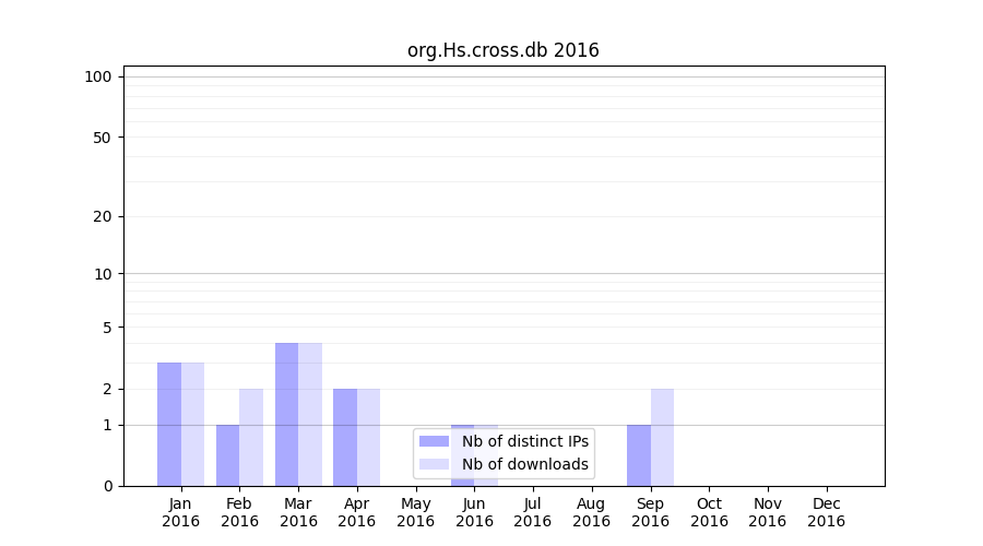 Number of downloads for annotation package org.Hs.cross.db, year by year, from 2025 back to 2014 (years with no downloads are omitted):