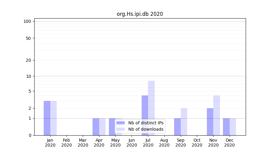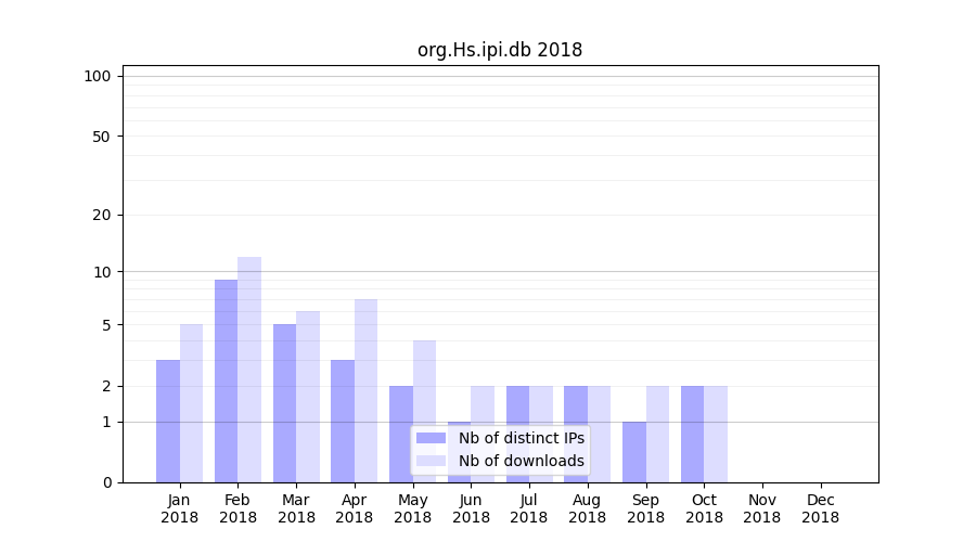 Number of downloads for annotation package org.Hs.ipi.db, year by year, from 2025 back to 2014 (years with no downloads are omitted):
