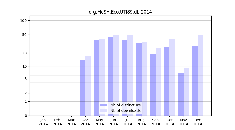 Number of downloads for annotation package org.MeSH.Eco.UTI89.db, year by year, from 2025 back to 2014 (years with no downloads are omitted):
