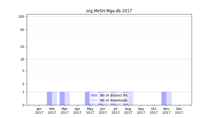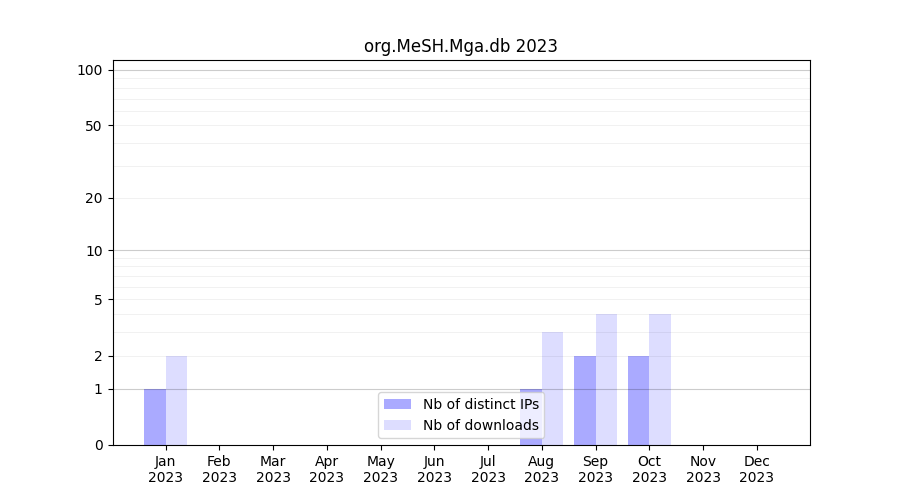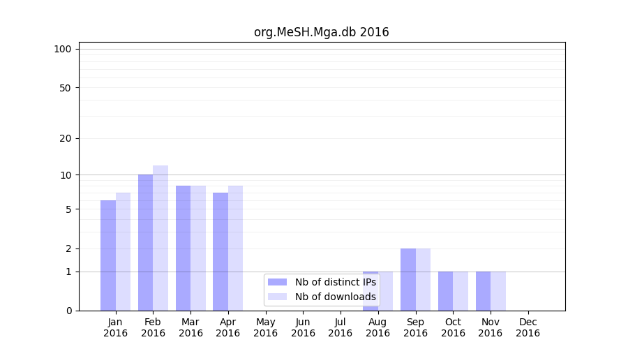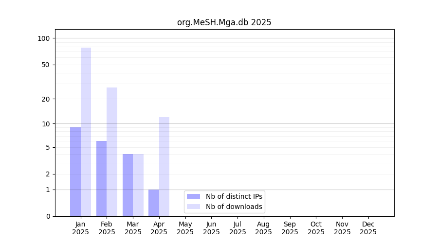 Number of downloads for annotation package org.MeSH.Mga.db, year by year, from 2025 back to 2014 (years with no downloads are omitted):