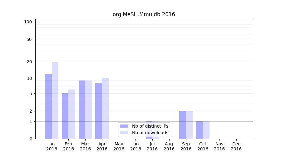 Number of downloads for annotation package org.MeSH.Mmu.db, year by year, from 2025 back to 2014 (years with no downloads are omitted):