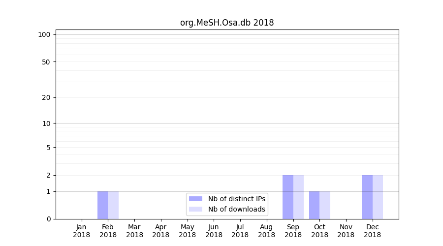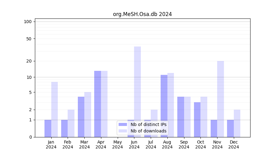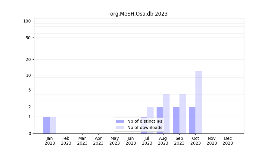 Number of downloads for annotation package org.MeSH.Osa.db, year by year, from 2025 back to 2014 (years with no downloads are omitted):