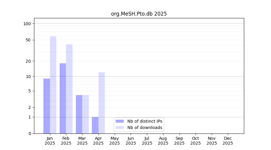 Number of downloads for annotation package org.MeSH.Pto.db, year by year, from 2025 back to 2014 (years with no downloads are omitted):