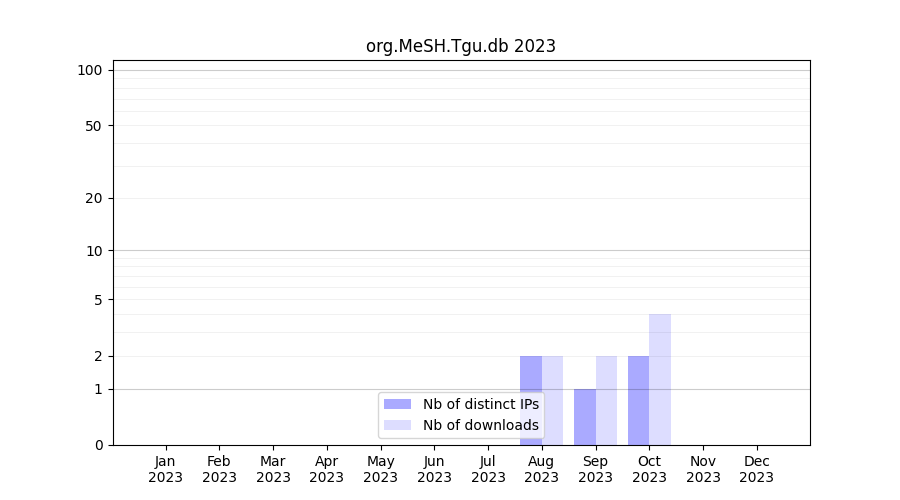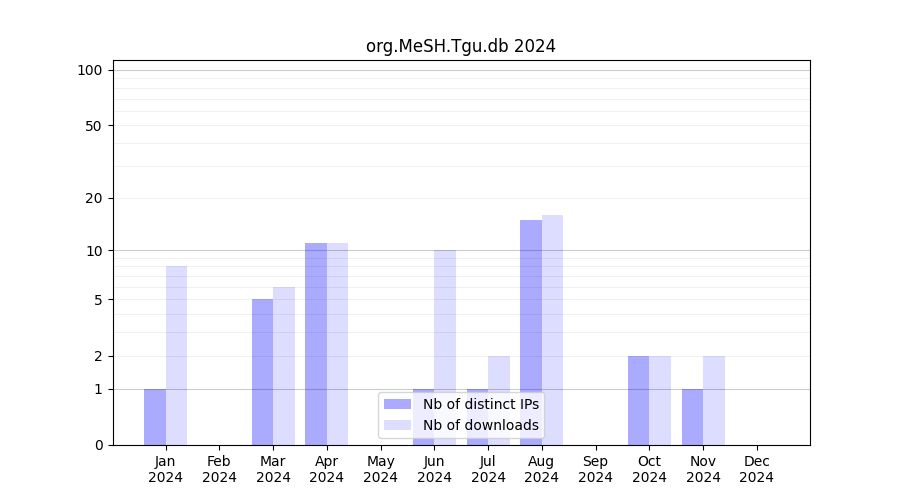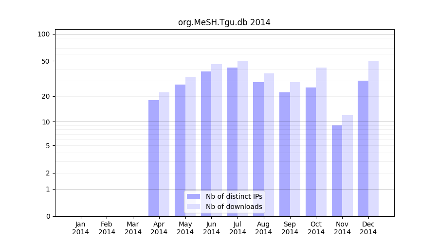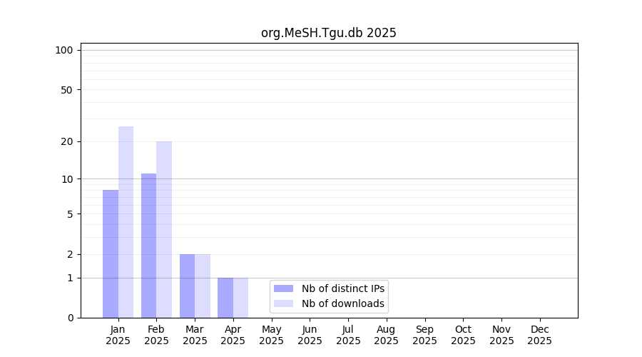Number of downloads for annotation package org.MeSH.Tgu.db, year by year, from 2025 back to 2014 (years with no downloads are omitted):