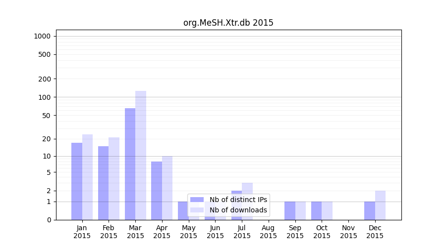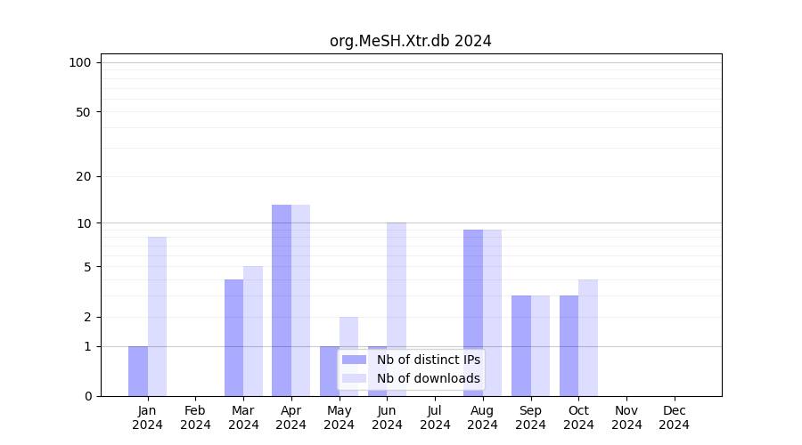 Number of downloads for annotation package org.MeSH.Xtr.db, year by year, from 2025 back to 2014 (years with no downloads are omitted):
