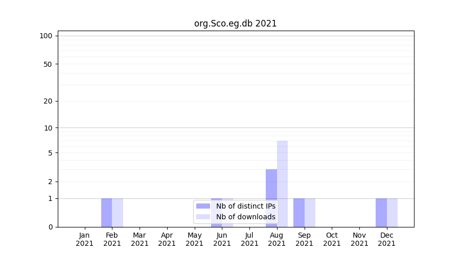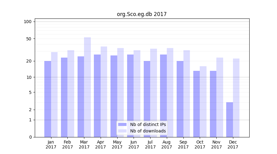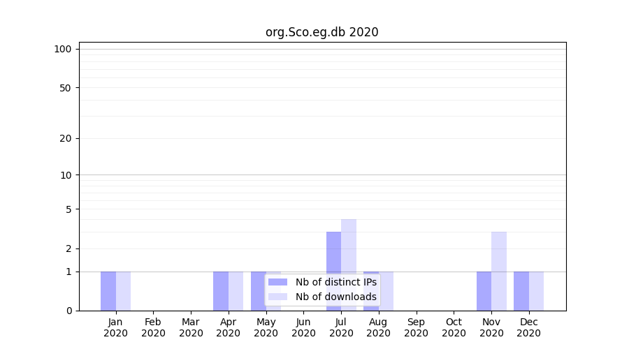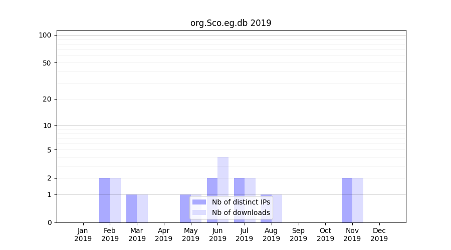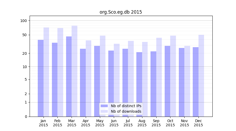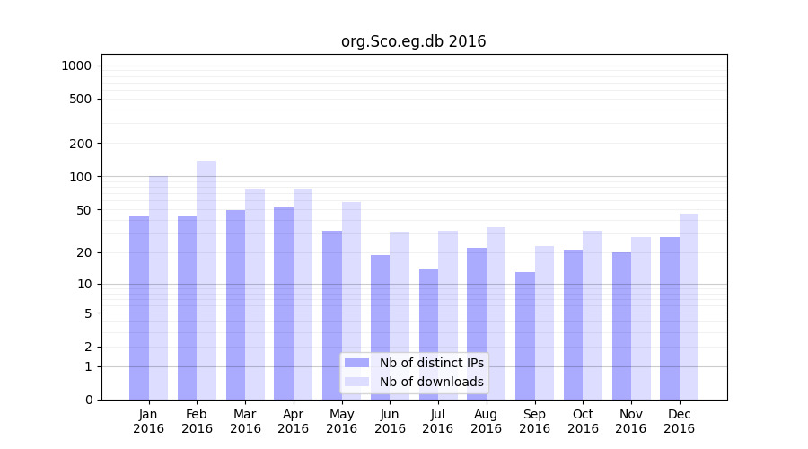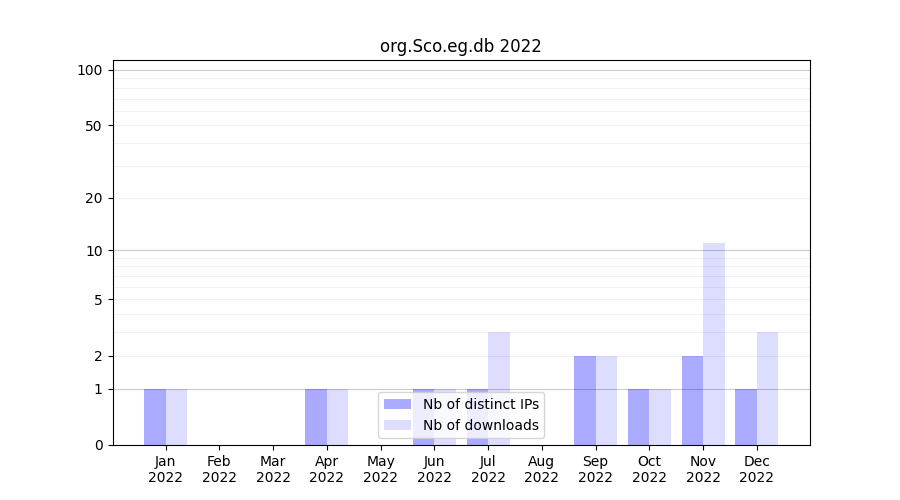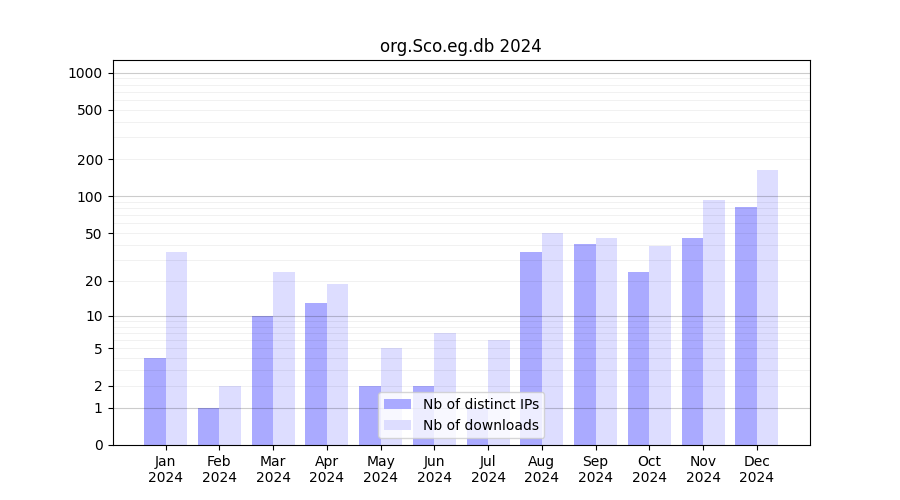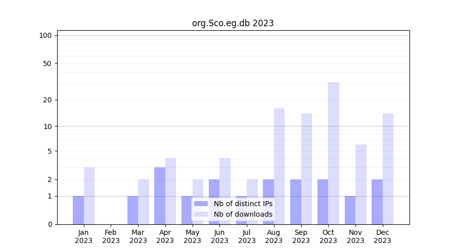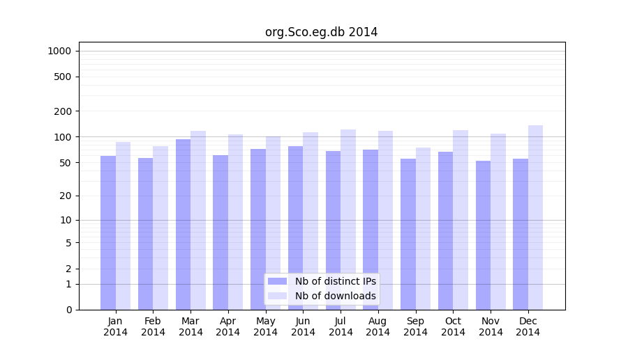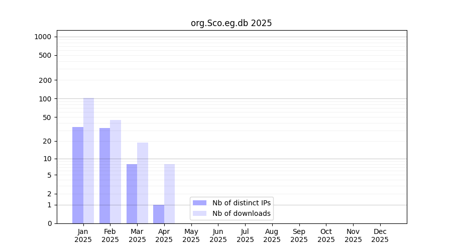 Number of downloads for annotation package org.Sco.eg.db, year by year, from 2025 back to 2014 (years with no downloads are omitted):