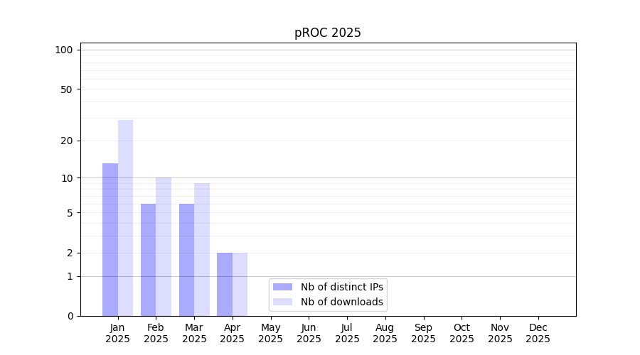 Number of downloads for annotation package pROC, year by year, from 2025 back to 2014 (years with no downloads are omitted):