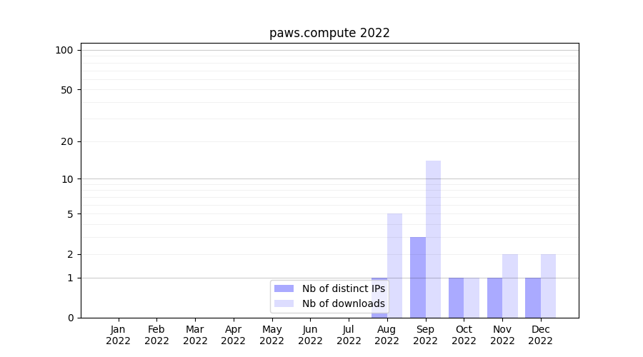Number of downloads for annotation package paws.compute, year by year, from 2025 back to 2014 (years with no downloads are omitted):