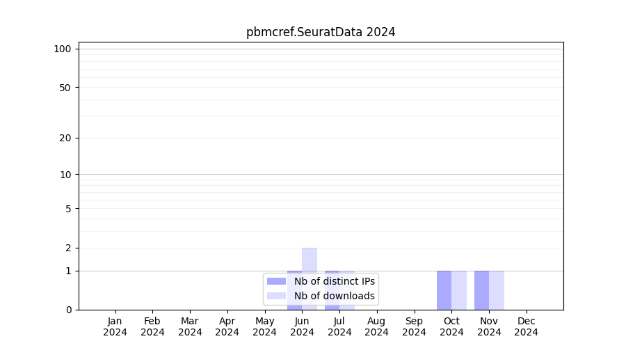 Number of downloads for annotation package pbmcref.SeuratData, year by year, from 2025 back to 2014 (years with no downloads are omitted):