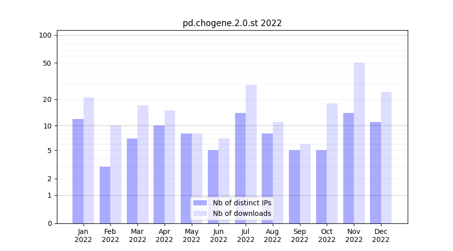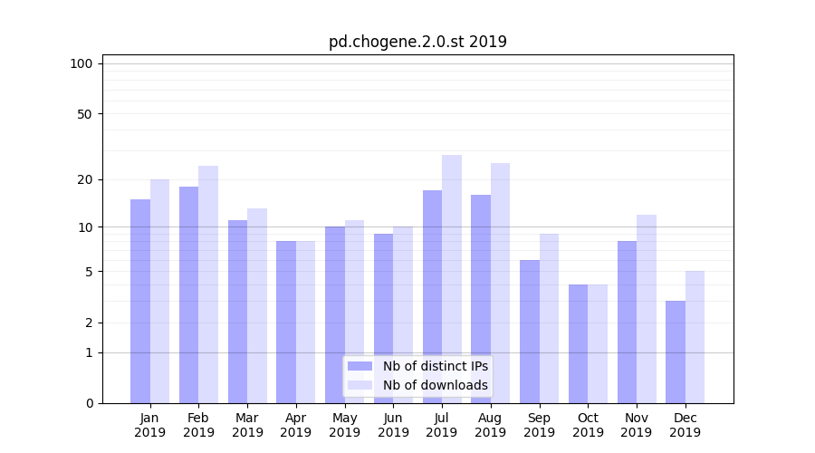 Number of downloads for annotation package pd.chogene.2.0.st, year by year, from 2025 back to 2014 (years with no downloads are omitted):