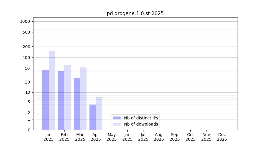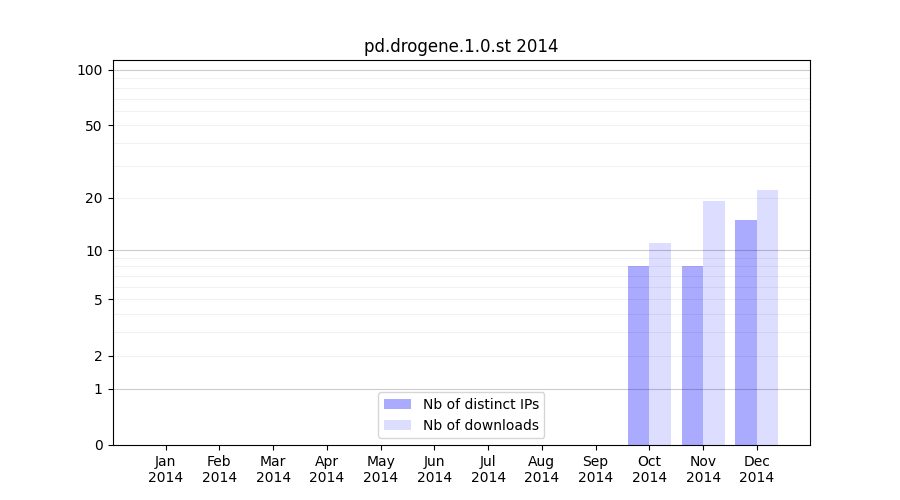 Number of downloads for annotation package pd.drogene.1.0.st, year by year, from 2025 back to 2014 (years with no downloads are omitted):