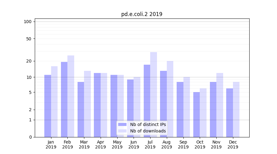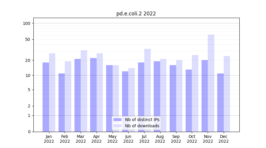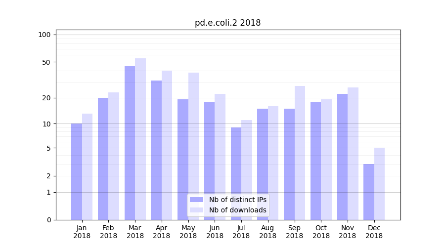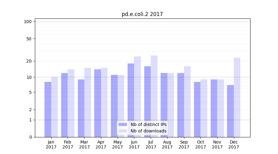 Number of downloads for annotation package pd.e.coli.2, year by year, from 2025 back to 2014 (years with no downloads are omitted):