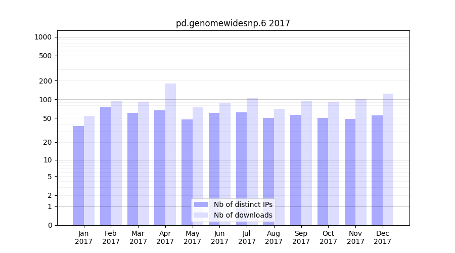Number of downloads for annotation package pd.genomewidesnp.6, year by year, from 2025 back to 2014 (years with no downloads are omitted):