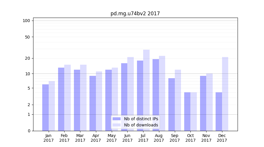 Number of downloads for annotation package pd.mg.u74bv2, year by year, from 2025 back to 2014 (years with no downloads are omitted):