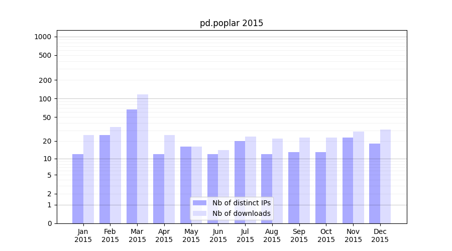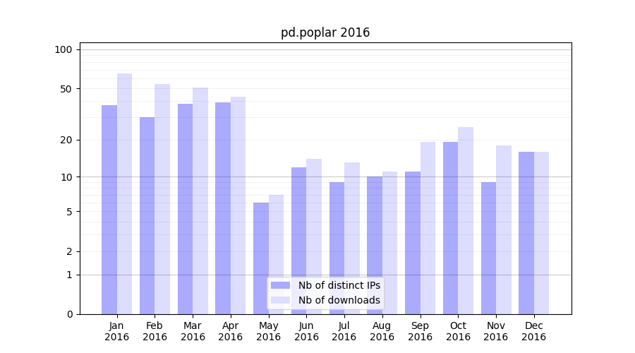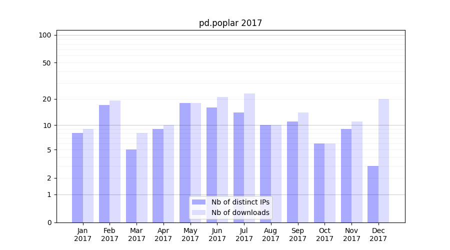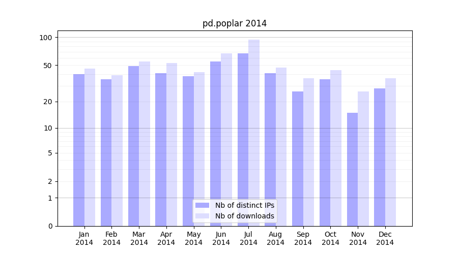 Number of downloads for annotation package pd.poplar, year by year, from 2025 back to 2014 (years with no downloads are omitted):