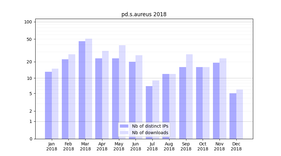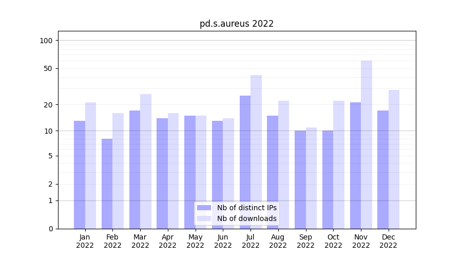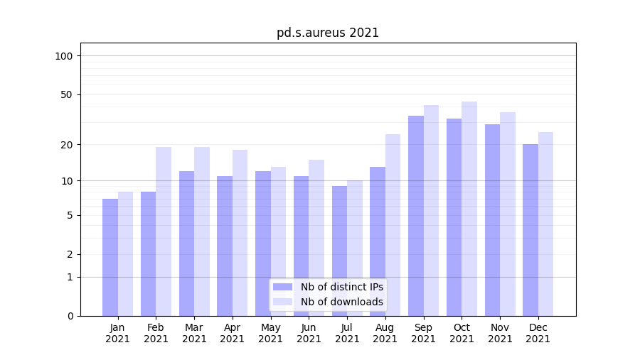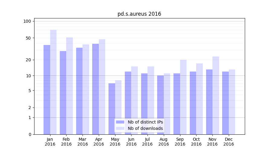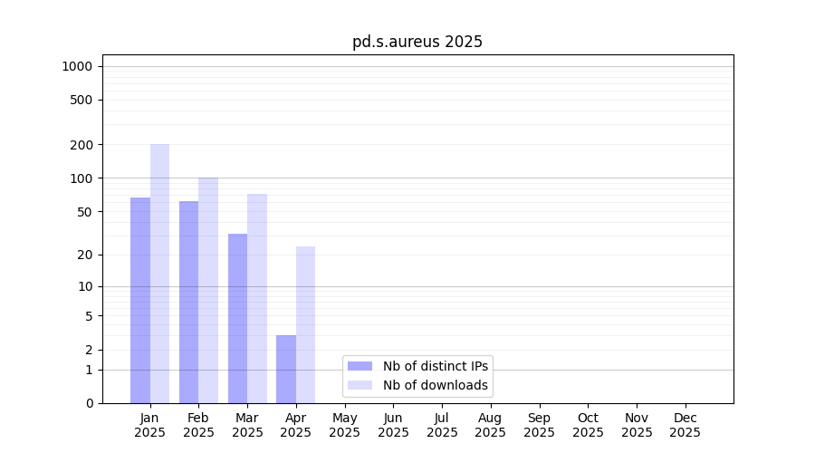 Number of downloads for annotation package pd.s.aureus, year by year, from 2025 back to 2014 (years with no downloads are omitted):