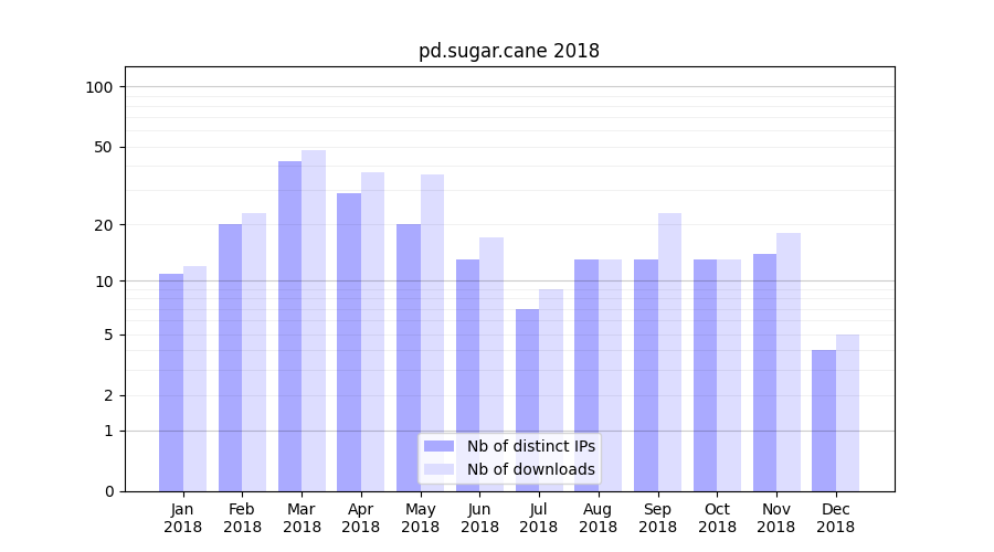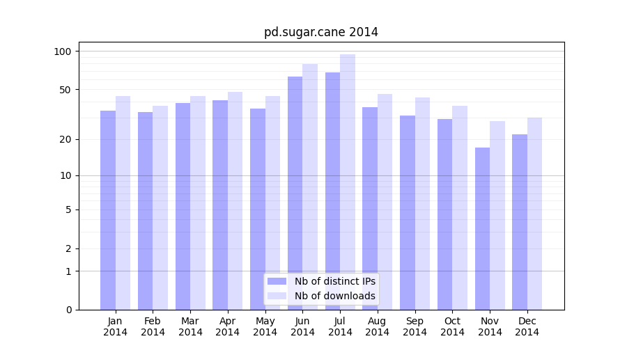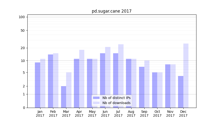 Number of downloads for annotation package pd.sugar.cane, year by year, from 2025 back to 2014 (years with no downloads are omitted):
