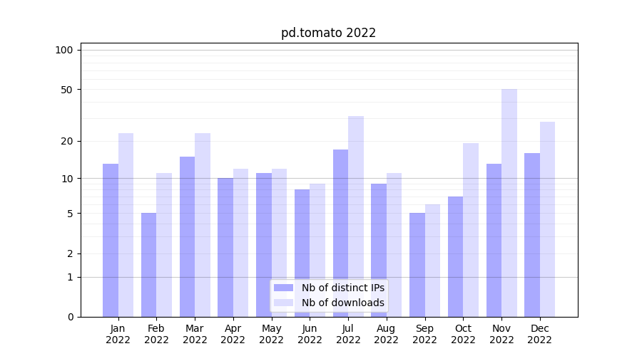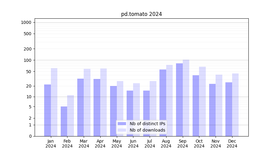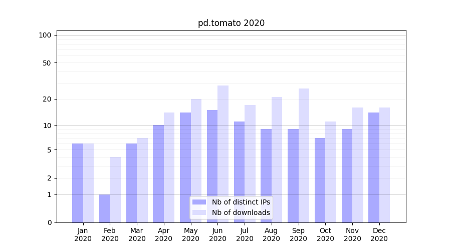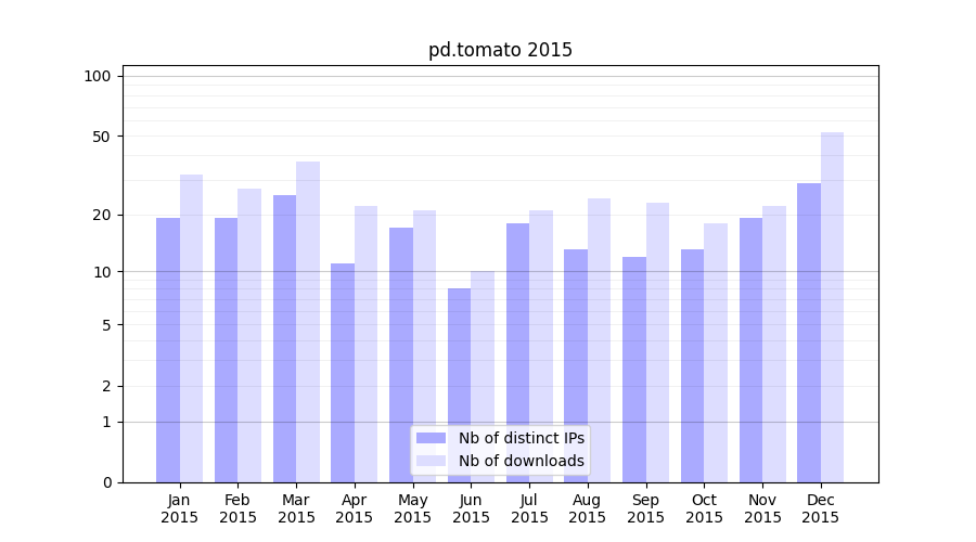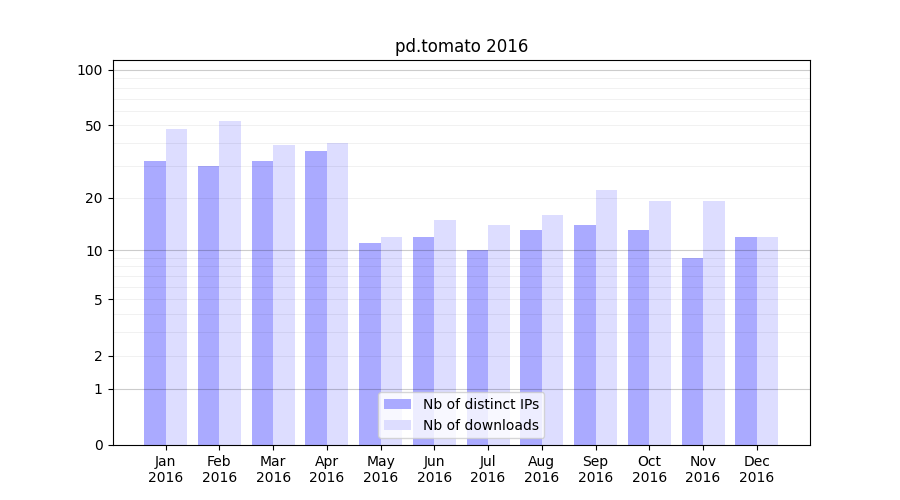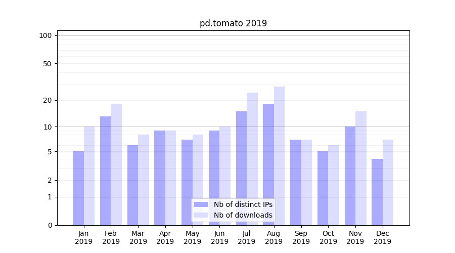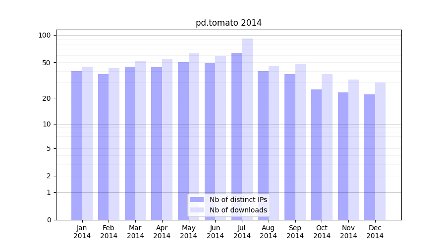 Number of downloads for annotation package pd.tomato, year by year, from 2025 back to 2014 (years with no downloads are omitted):