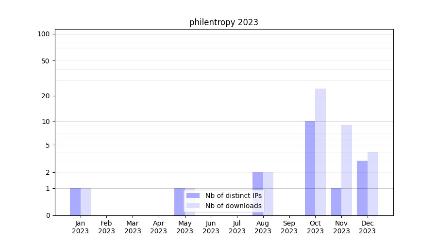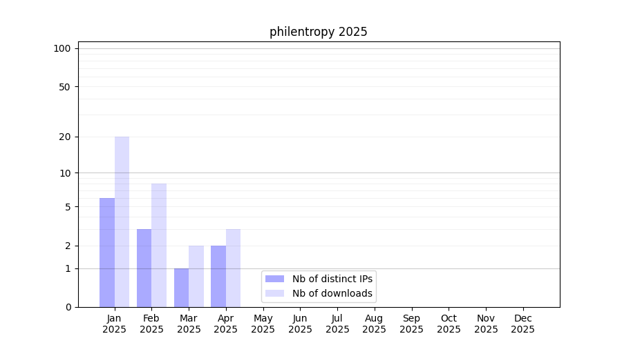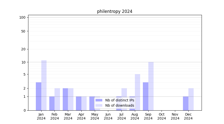 Number of downloads for annotation package philentropy, year by year, from 2025 back to 2014 (years with no downloads are omitted):