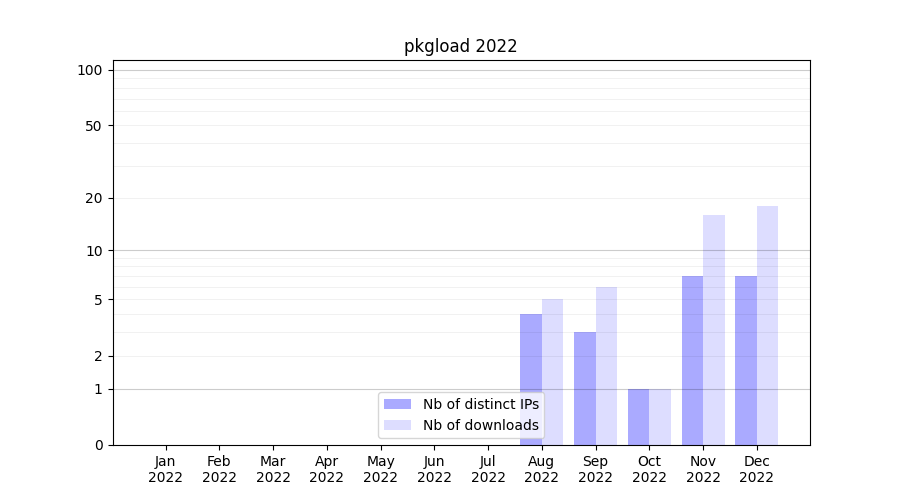 Number of downloads for annotation package pkgload, year by year, from 2025 back to 2014 (years with no downloads are omitted):