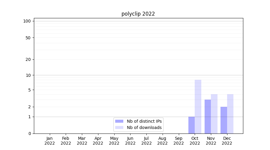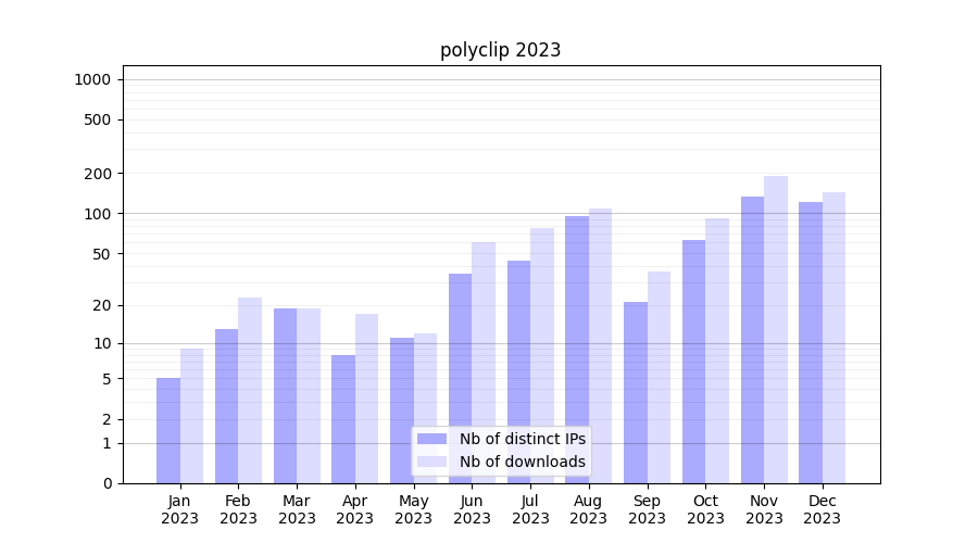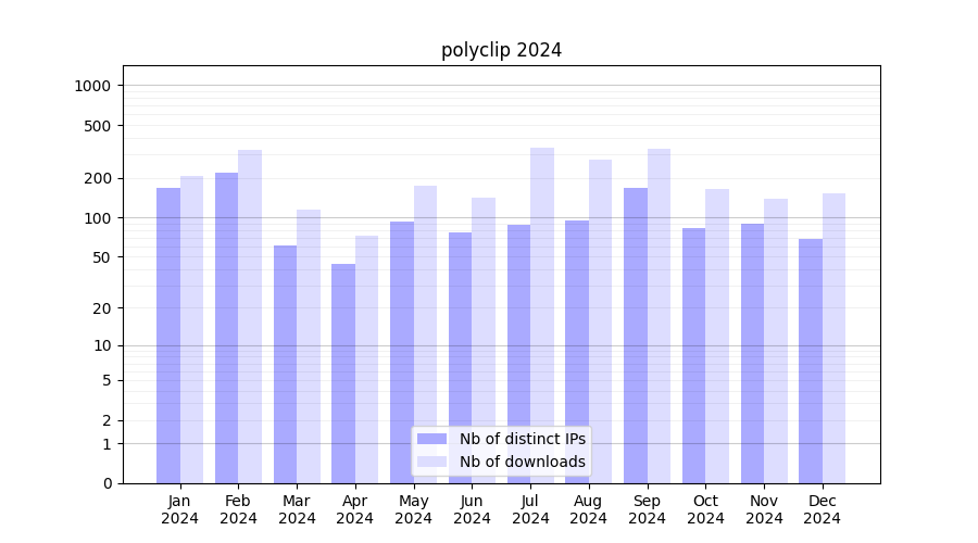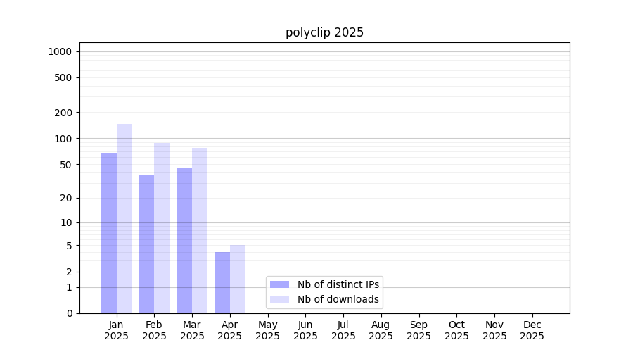 Number of downloads for annotation package polyclip, year by year, from 2025 back to 2014 (years with no downloads are omitted):