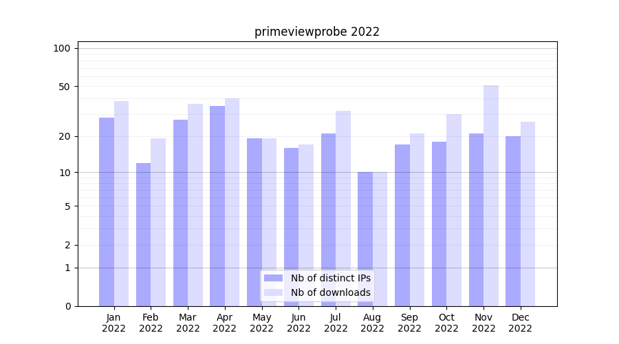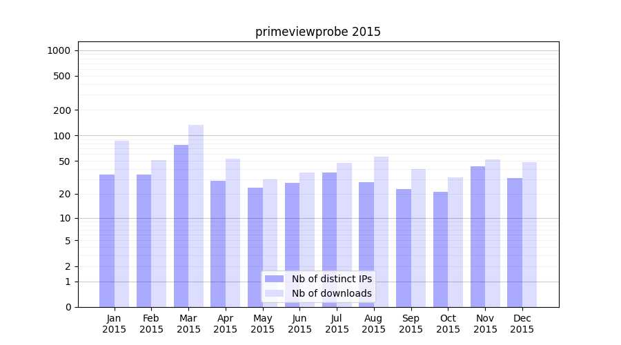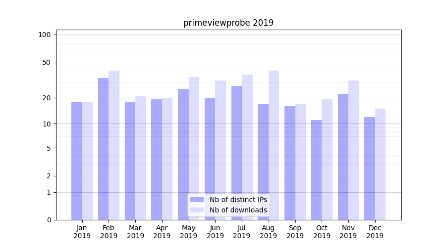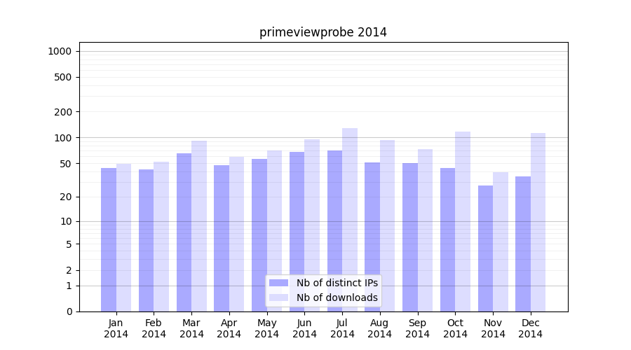 Number of downloads for annotation package primeviewprobe, year by year, from 2025 back to 2014 (years with no downloads are omitted):