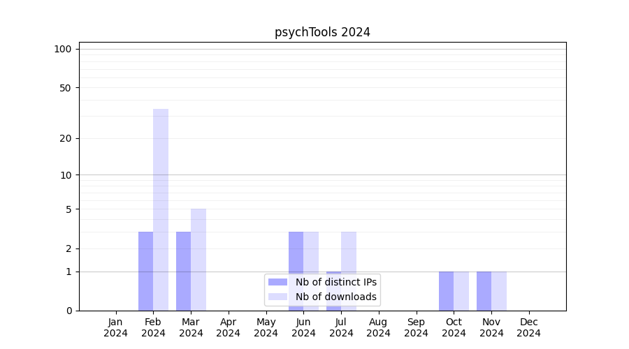 Number of downloads for annotation package psychTools, year by year, from 2025 back to 2014 (years with no downloads are omitted):