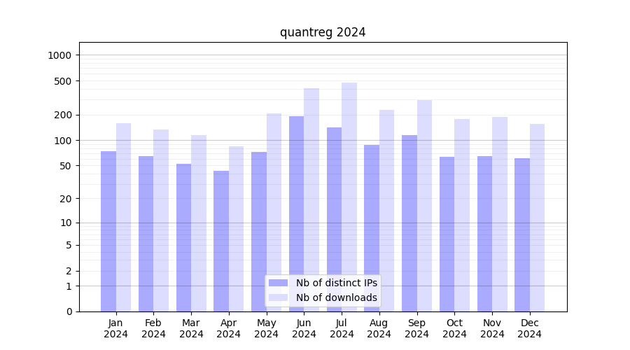 Number of downloads for annotation package quantreg, year by year, from 2025 back to 2014 (years with no downloads are omitted):