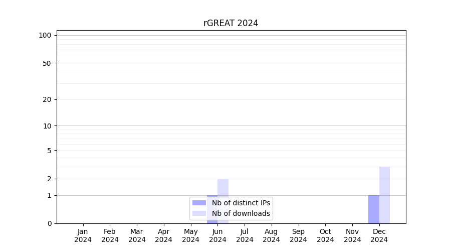 Number of downloads for annotation package rGREAT, year by year, from 2025 back to 2014 (years with no downloads are omitted):