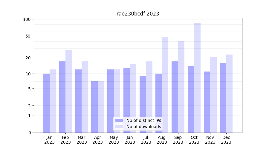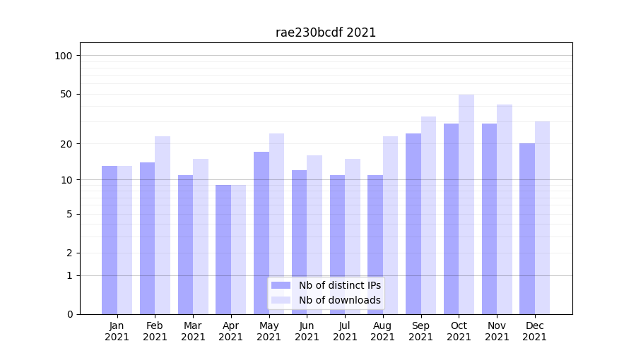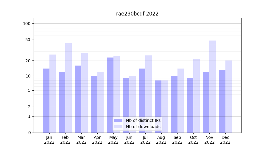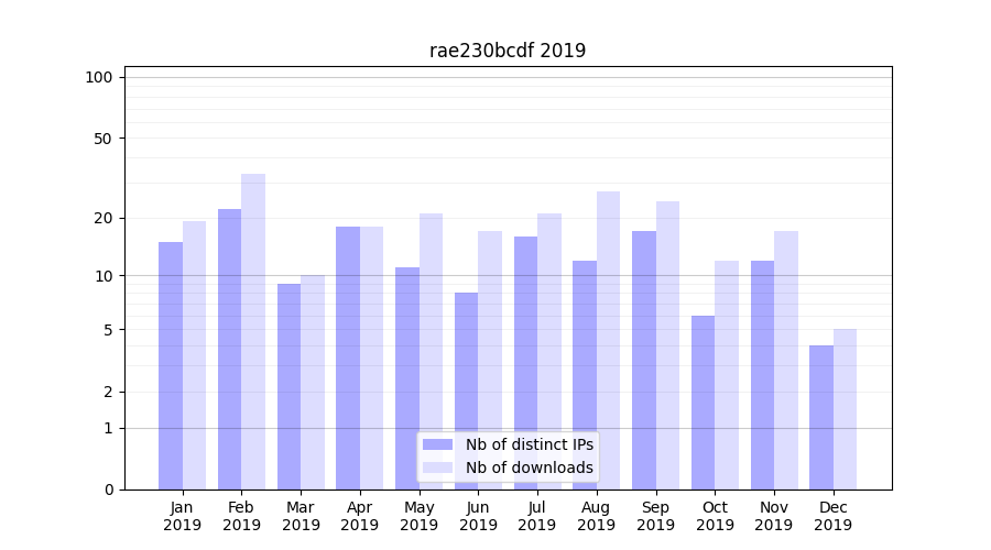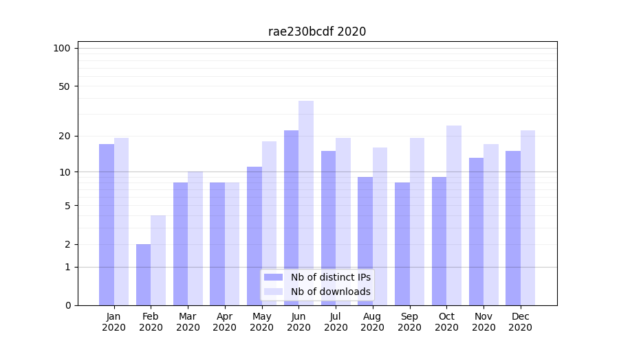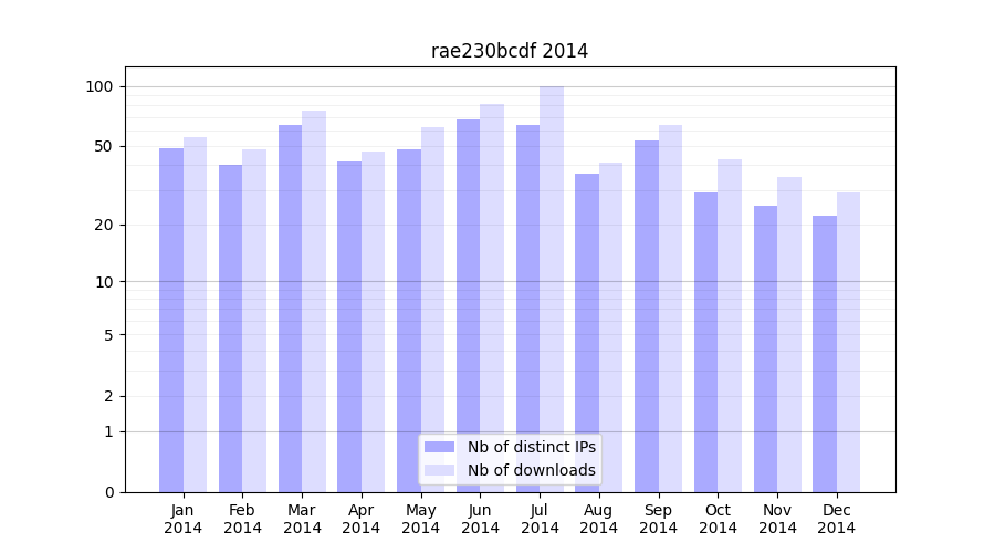 Number of downloads for annotation package rae230bcdf, year by year, from 2025 back to 2014 (years with no downloads are omitted):