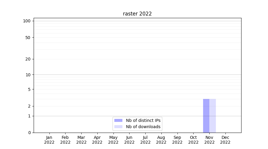 Number of downloads for annotation package raster, year by year, from 2025 back to 2014 (years with no downloads are omitted):