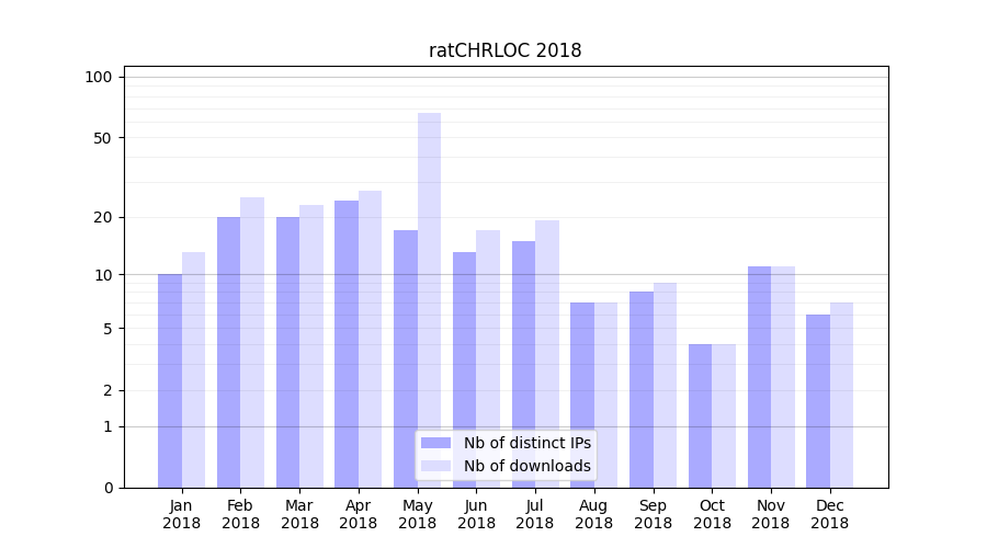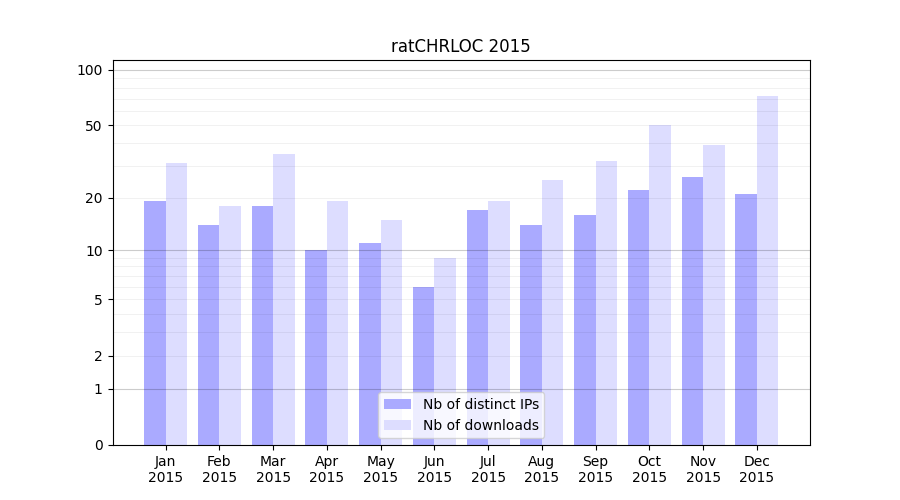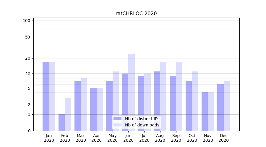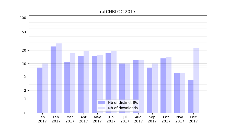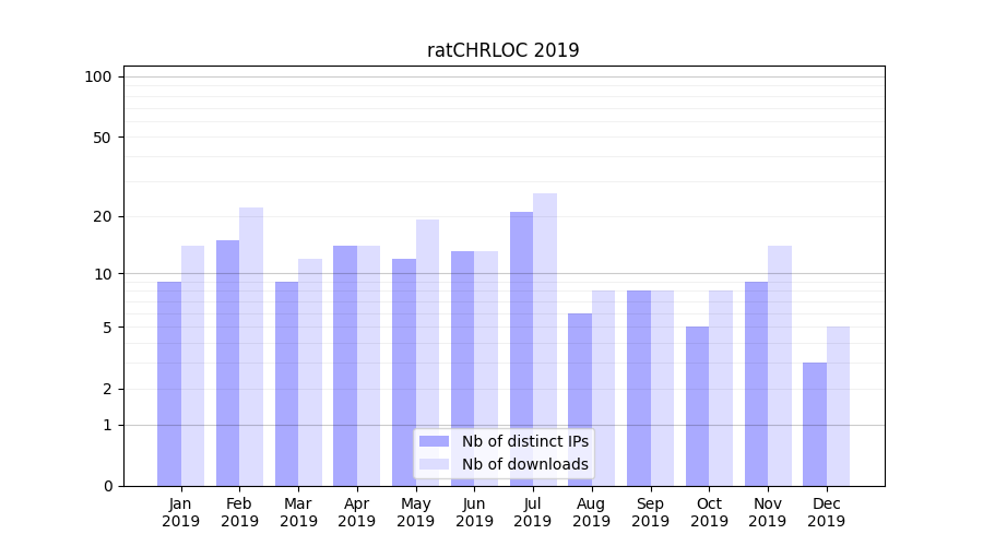 Number of downloads for annotation package ratCHRLOC, year by year, from 2025 back to 2014 (years with no downloads are omitted):