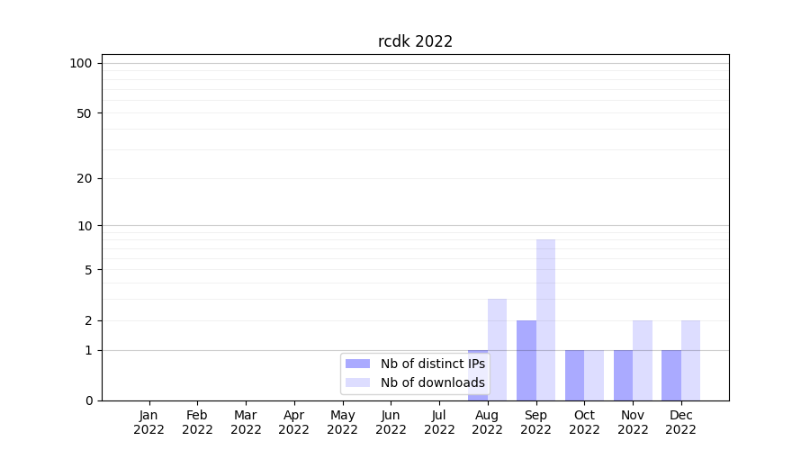Number of downloads for annotation package rcdk, year by year, from 2025 back to 2014 (years with no downloads are omitted):