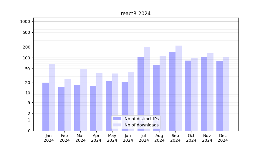 Number of downloads for annotation package reactR, year by year, from 2025 back to 2014 (years with no downloads are omitted):
