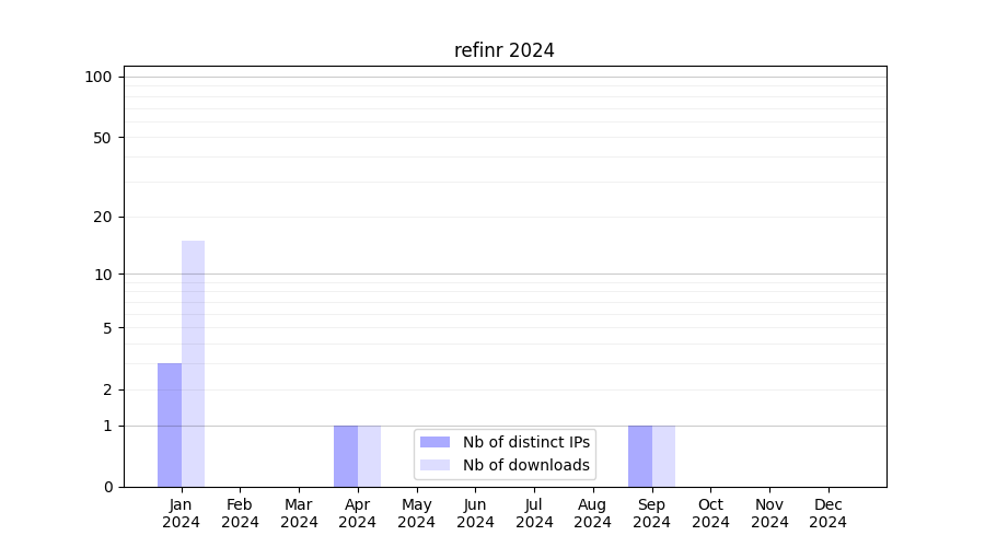 Number of downloads for annotation package refinr, year by year, from 2025 back to 2014 (years with no downloads are omitted):