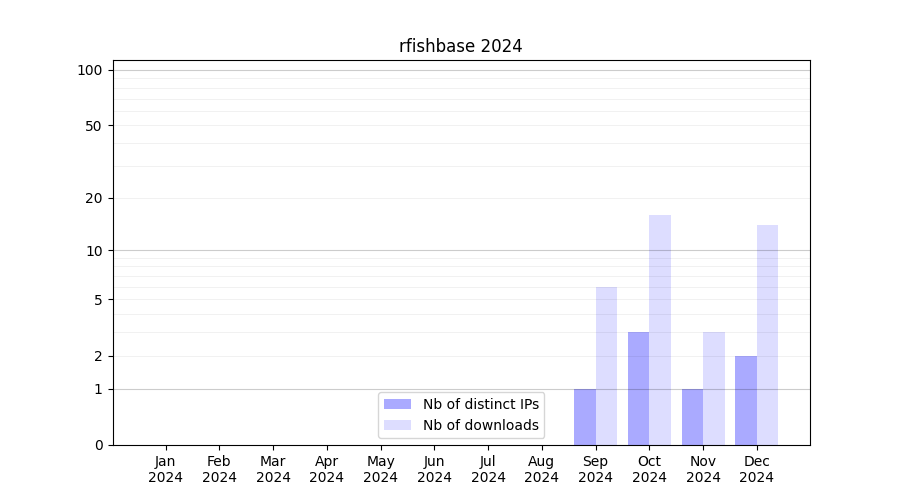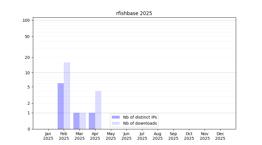 Number of downloads for annotation package rfishbase, year by year, from 2025 back to 2014 (years with no downloads are omitted):