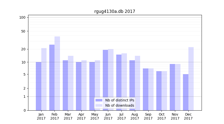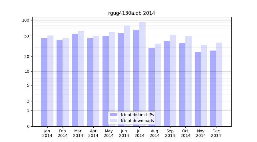 Number of downloads for annotation package rgug4130a.db, year by year, from 2025 back to 2014 (years with no downloads are omitted):