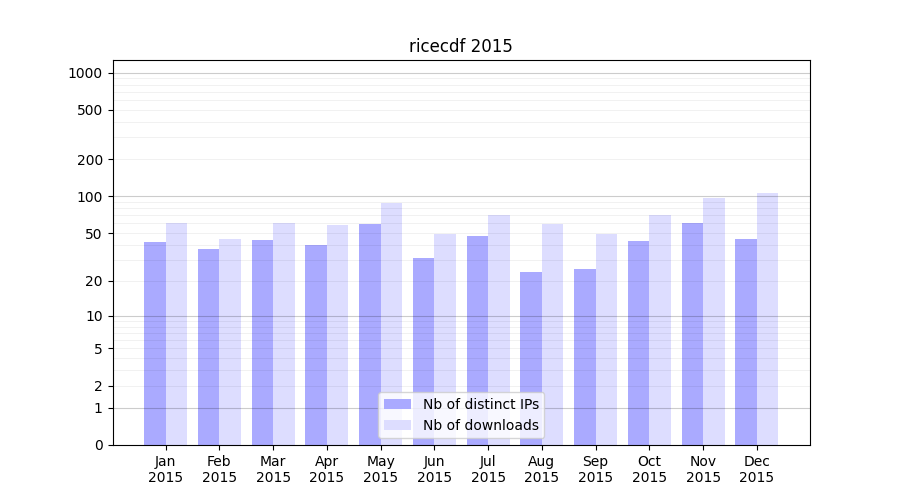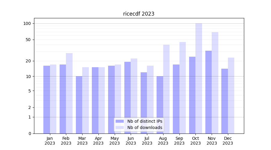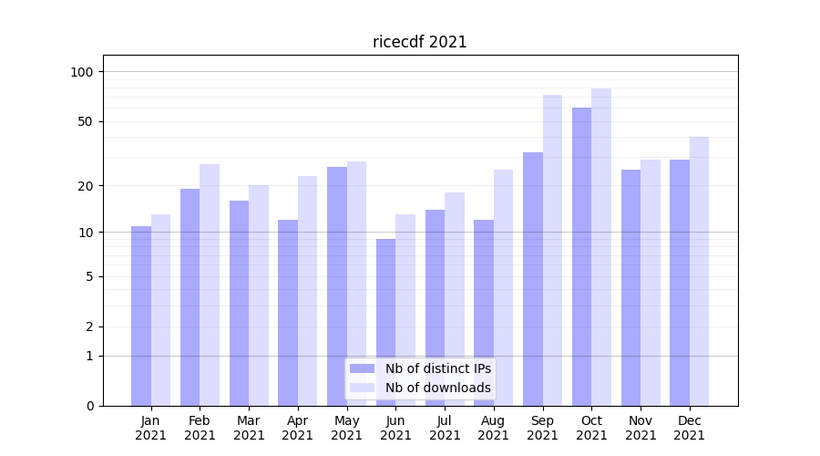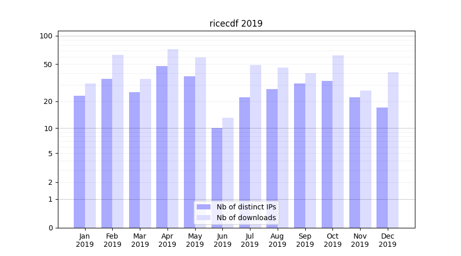 Number of downloads for annotation package ricecdf, year by year, from 2025 back to 2014 (years with no downloads are omitted):