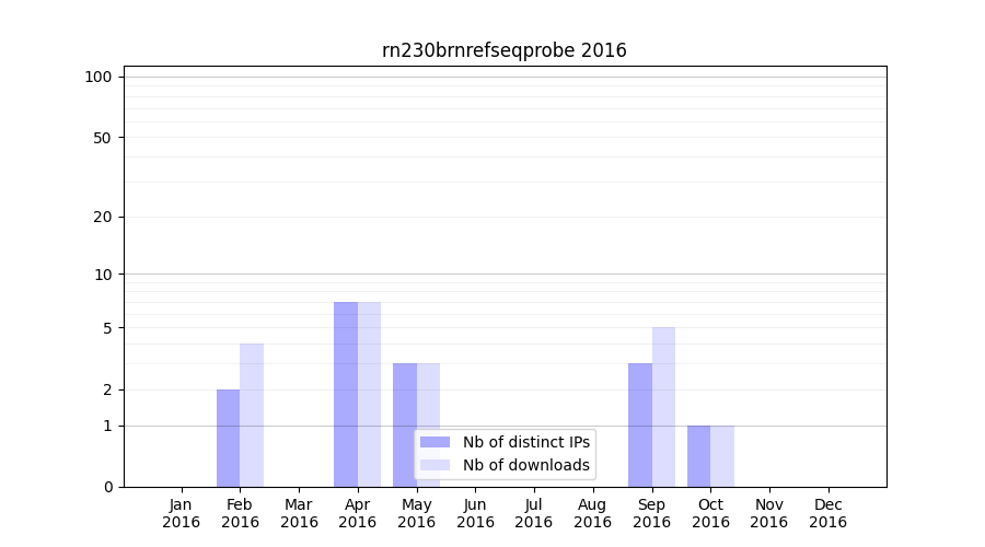 Number of downloads for annotation package rn230brnrefseqprobe, year by year, from 2025 back to 2014 (years with no downloads are omitted):