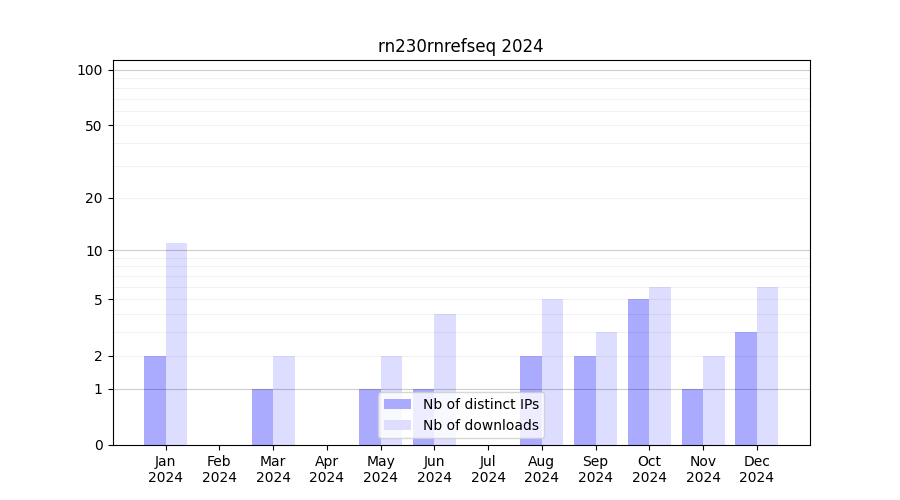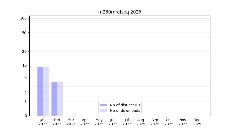 Number of downloads for annotation package rn230rnrefseq, year by year, from 2025 back to 2014 (years with no downloads are omitted):