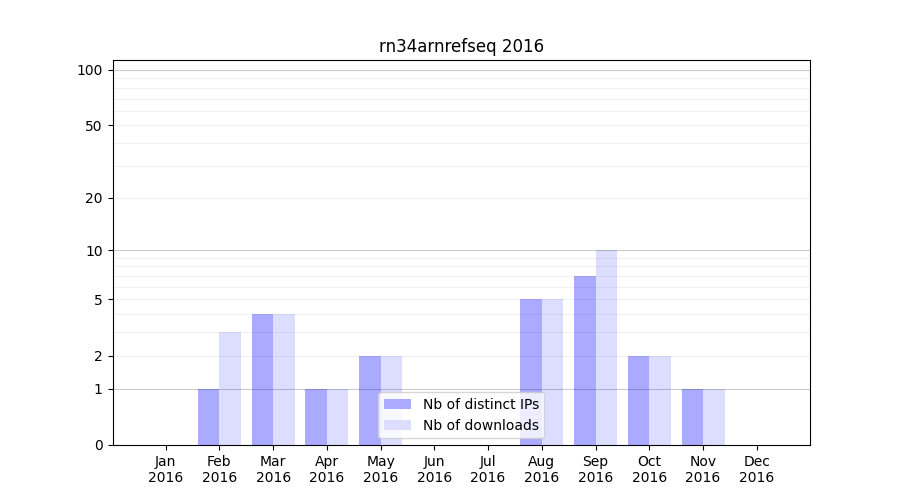 Number of downloads for annotation package rn34arnrefseq, year by year, from 2025 back to 2014 (years with no downloads are omitted):