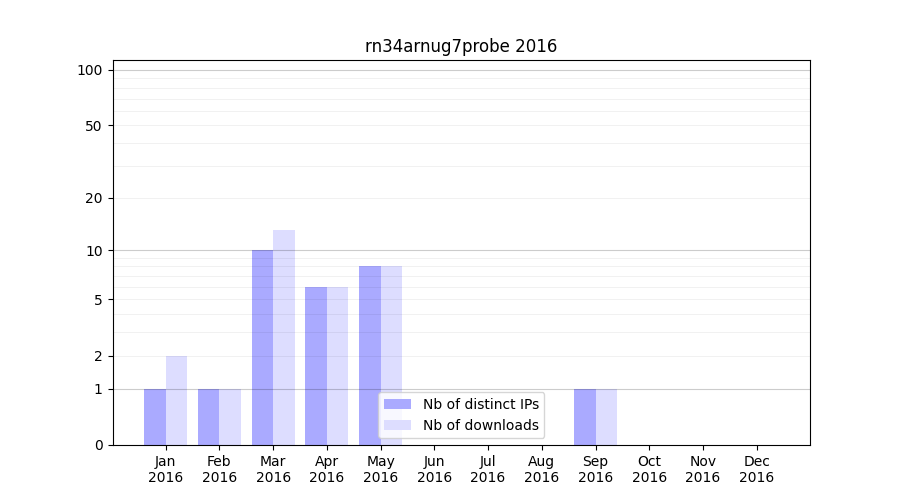 Number of downloads for annotation package rn34arnug7probe, year by year, from 2025 back to 2014 (years with no downloads are omitted):